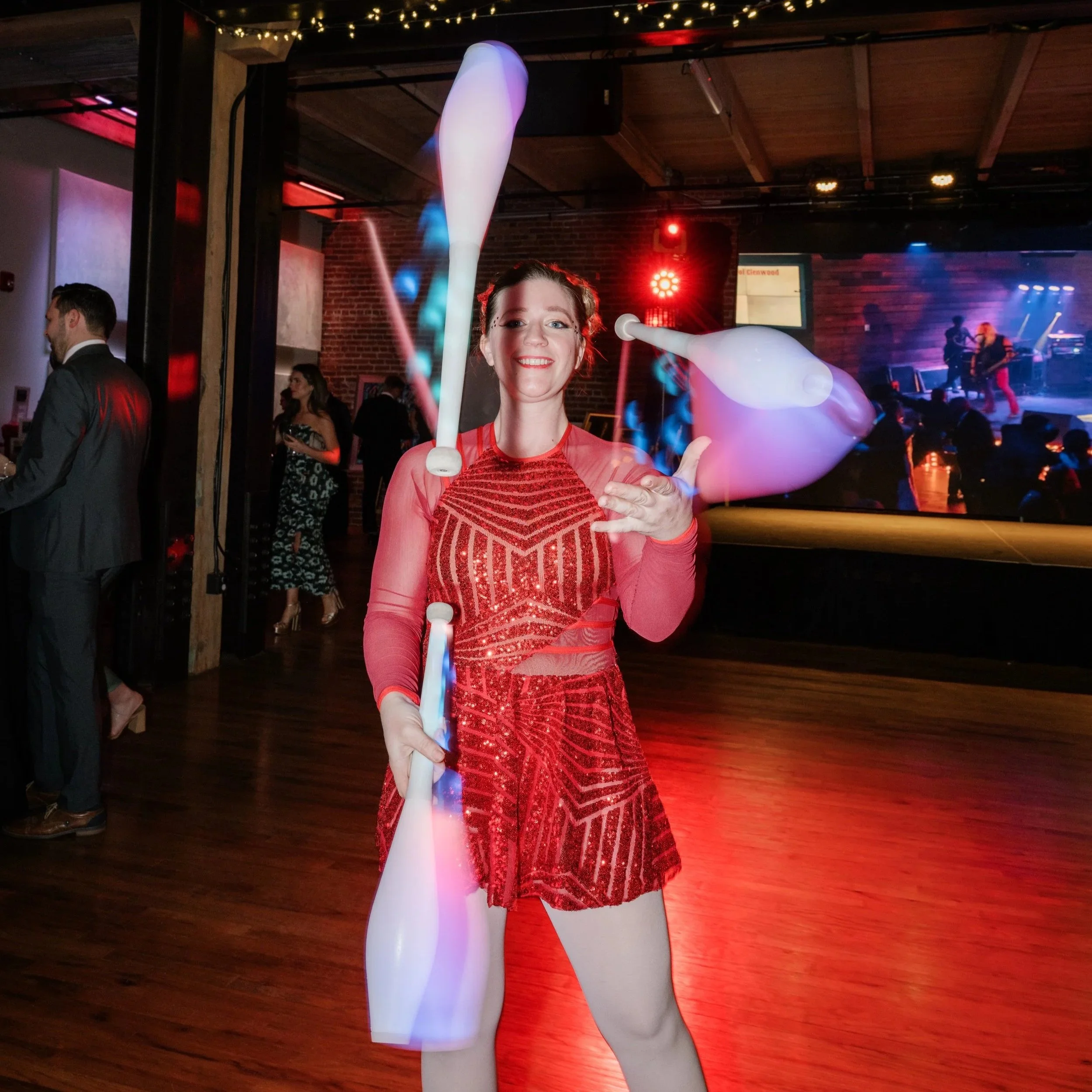 Performers toss and manipulate props such as clubs, hoops, poi and juggling balls.
